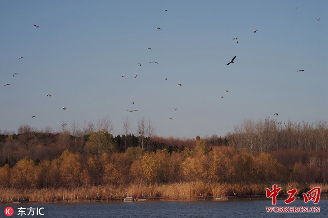 2018年11月21日,北京初冬奥林匹克公园飞来苍鹭,有的盘旋,有的在草丛中休息,成群的苍鹭飞起很是壮观。