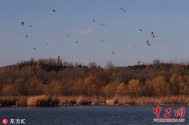 2018年11月21日,北京初冬奥林匹克公园飞来苍鹭,有的盘旋,有的在草丛中休息,成群的苍鹭飞起很是壮观。