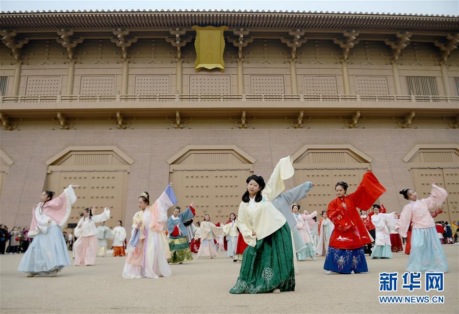 11月24日,汉服爱好者在西安大明宫国家遗址公园丹凤门前进行表演。 新华社记者 刘潇 摄