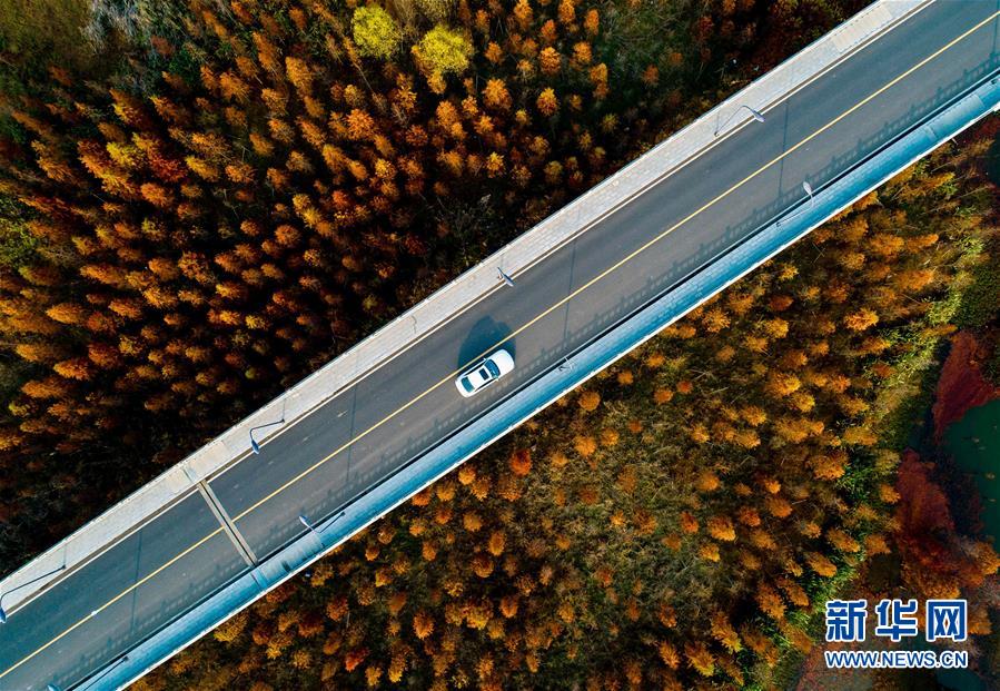 11月24日拍摄的江苏省盱眙县天泉湖红杉林景色(无人机拍摄)。 新华社发(汤德宏 摄)