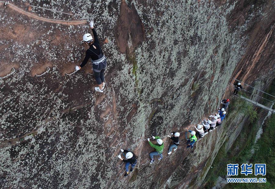 游客在湖南省张家界市慈利县红岩岭户外拓展运动欢乐园体验飞拉达攀岩游览项目(11月28日无人机拍摄)。 初冬时节,湖南省慈利县红岩岭户外拓展运动欢乐园吸引众多户外运动爱好者。人们体验攀岩及钢索吊桥运动,挑战自我,享受冬日户外运动的乐趣。 新华社发(吴勇兵 摄)