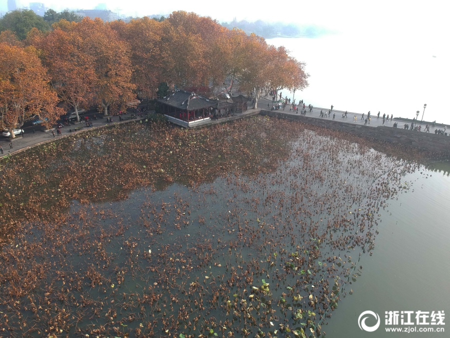 11月28日,一场大雾过后,航拍初冬薄雾朦胧的西湖景区,五彩斑斓,令人心驰神往。(浙江在线记者 汪驰超 尹海木 摄)