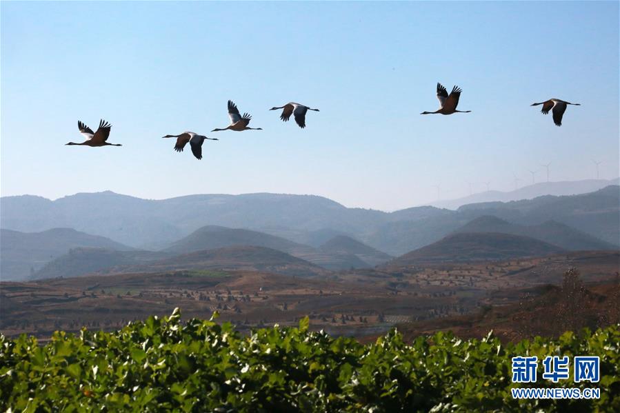 这是11月29日在位于贵州省威宁彝族回族苗族自治县的贵州草海国家级自然保护区内拍摄的黑颈鹤。 据贵州草海国家级自然保护区管理委员会统计,日前已有上千只黑颈鹤飞抵草海越冬。 新华社发(王纯亮 摄)