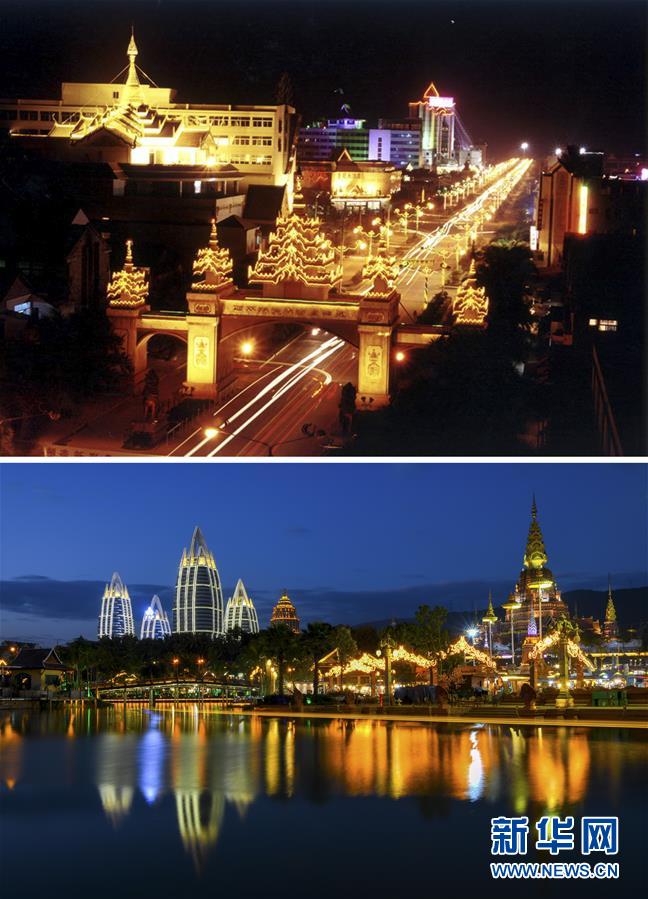 拼版照片:上图为1996年拍摄的西双版纳旅游度假区大门(资料照片);下图为景洪市新地标——告庄夜景(12月1日新华社记者江文耀摄)。 新华社发