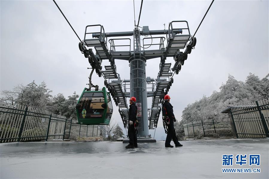 12月9日,湖南张家界武陵源风景区黄石寨索道巡检工金二成(右)、陈宬在地面观察索道运行情况。 受冷空气影响,湖南张家界武陵源风景区出现冰雪天气,当地旅游部门和景区企业加大对高空索道等游览运输工具的安全巡检力度,及时排除冰雪天气带来的安全隐患,保障游览安全。 新华社发(吴勇兵 摄)