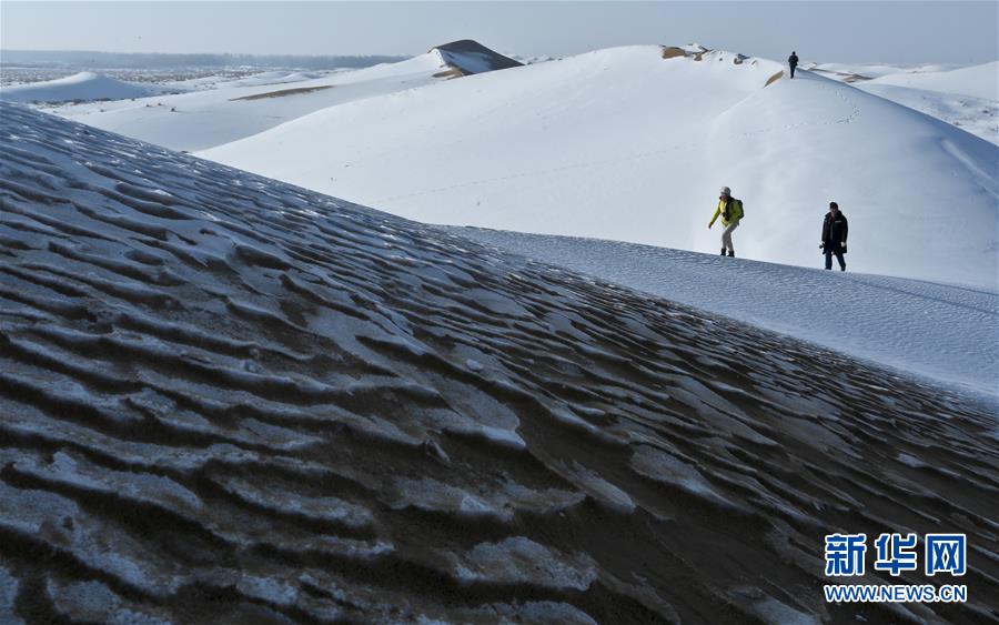 12月9日,游客在巴丹吉林沙漠边缘观赏雪后沙漠美景。新华社发(王将 摄)