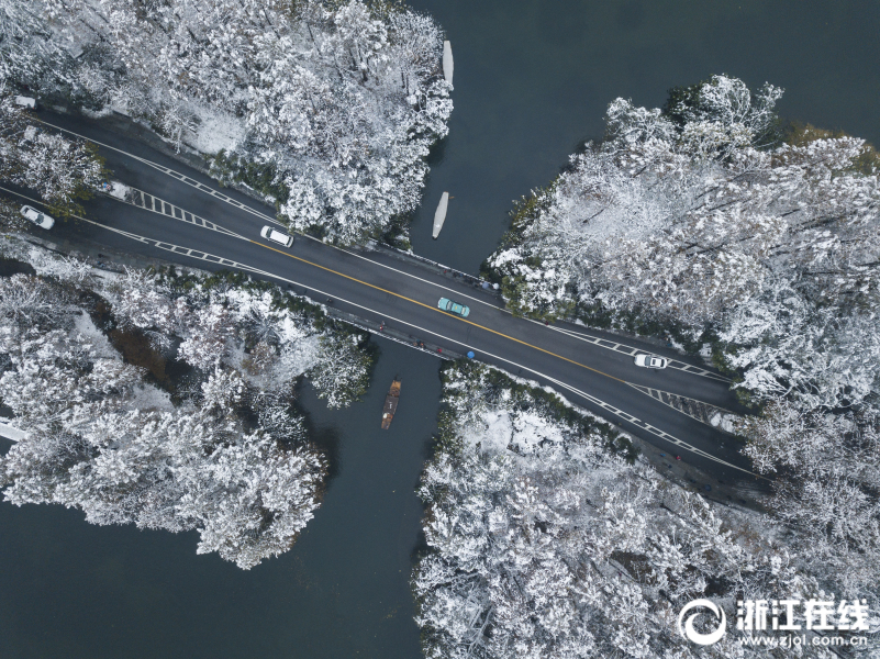 12月9日,一夜风雪过后,杭州西湖的杨公堤上银装素裹,景色格外宜人。湖边的古建筑,搭配上雪景,让人仿佛置身仙境。(记者 张孙超 汪驰超 摄)