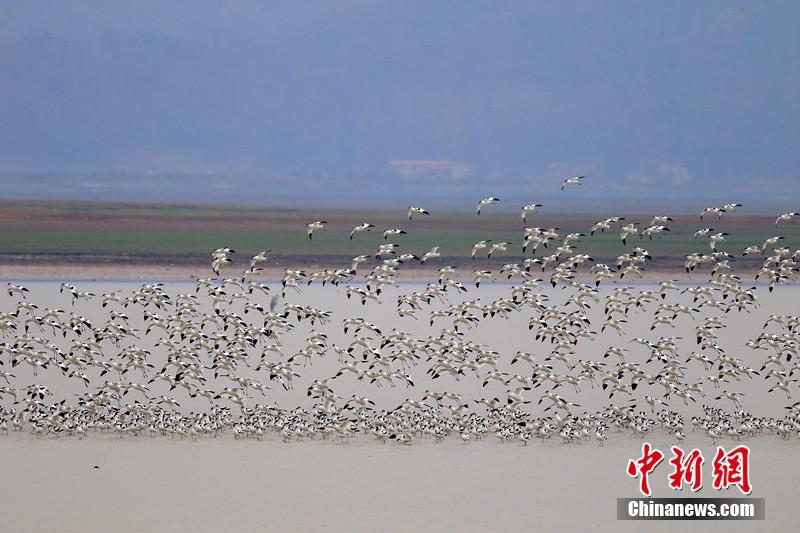 近日,安徽桐城蔡子湖上万只候鸟向南迁徙越冬,振翅翱翔蓝天之际,宛如层层“云浪”甚为壮观。 据介绍,这些候鸟主要为反嘴鹬,是一种长腿的涉水鸟,主要生活在湿地和靠近海湾碱性的湖里,背部有醒目的黑色和白色标志。图/石晓红 文/刘浩