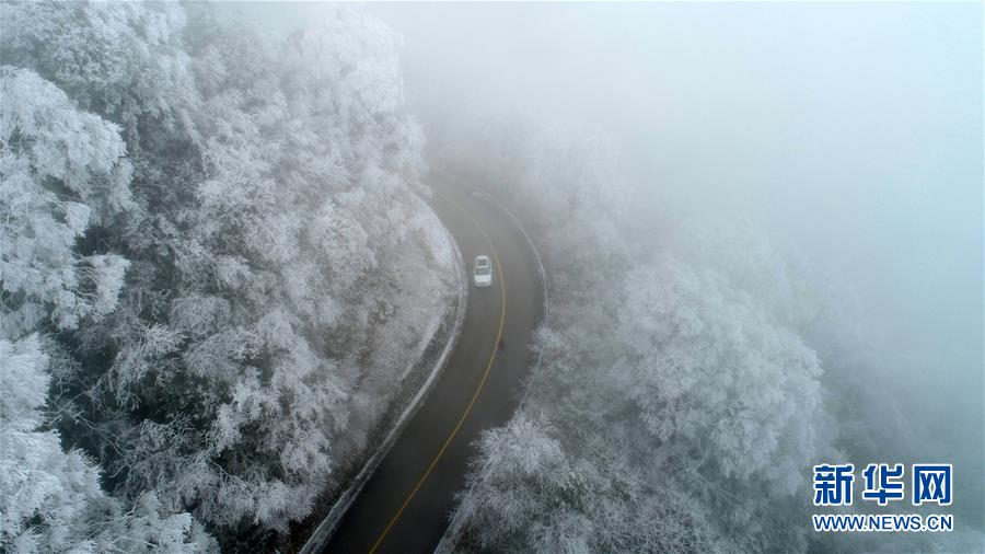 12月9日,在贵州雷山至榕江X803县级公路上,养护工作人员在撒盐除冰雪(无人机拍摄)。 新华社发(吴吉斌 摄)