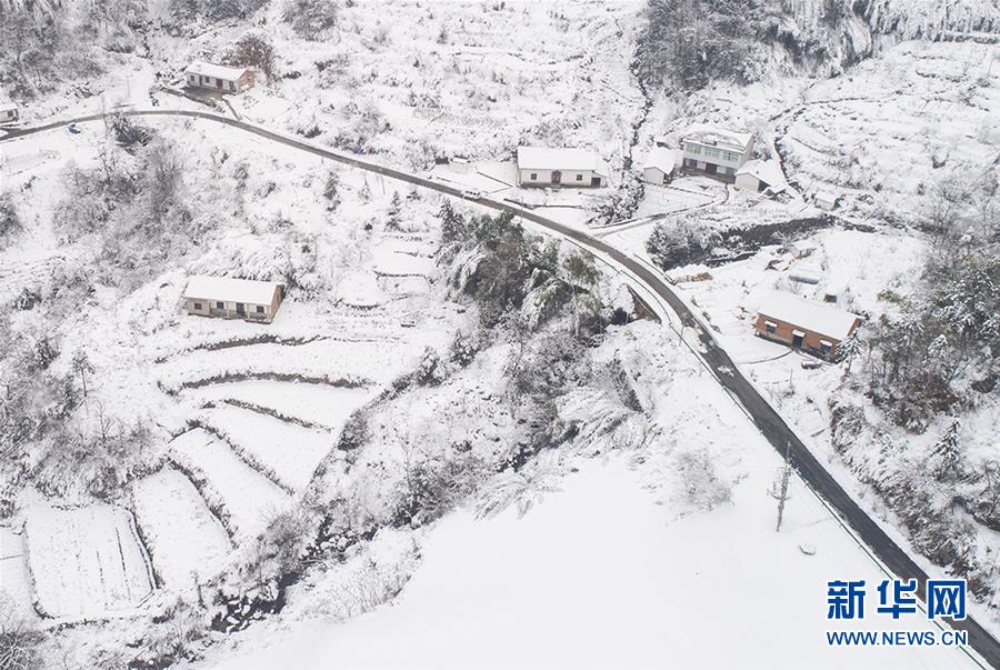12月9日拍摄的雪中的安徽省六安市霍山县大别山旅游扶贫通道(无人机拍摄)。新华社发(徐程 摄)