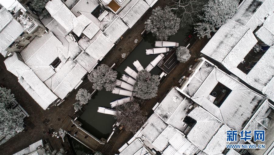 12月9日拍摄的雪后的江苏苏州同里古镇(无人机拍摄)。 新华社发(吴斌 摄)