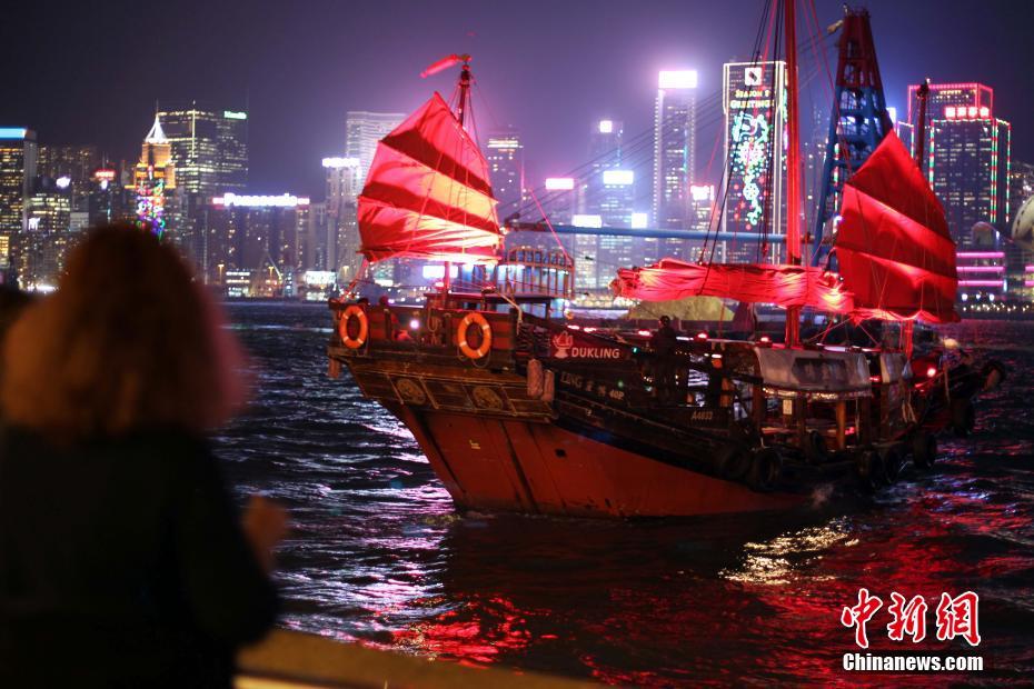 12月10日晚,满载游客的仿古帆船在灯会璀璨的维港两岸穿梭,景色美不胜收。近日,香港尖东海滨一带的商厦点亮了璀璨的圣诞节灯饰,照耀维港两岸。受惠“一桥一铁”通车带动,大批游客莅临香港,给香港零售市道带来可观收益。中新社记者 洪少葵 摄