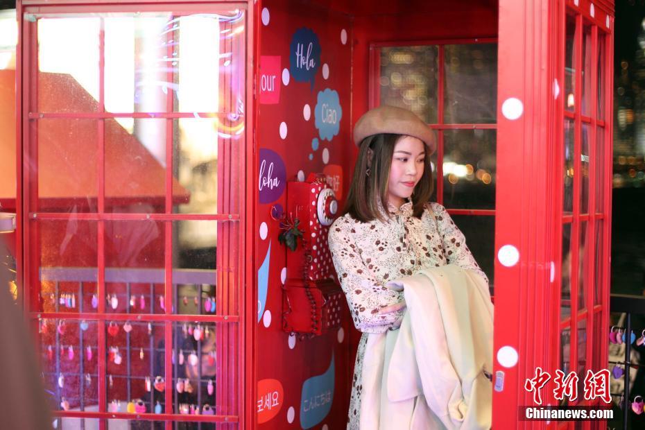 12月10日晚,一位游客在海港城圣诞装饰里拍照。近日,香港尖东海滨一带的商厦点亮了璀璨的圣诞节灯饰,照耀维港两岸。即使圣诞节并非内地假期,但受惠“一桥一铁”通车带动,香港零售市道向好。中新社记者 洪少葵 摄