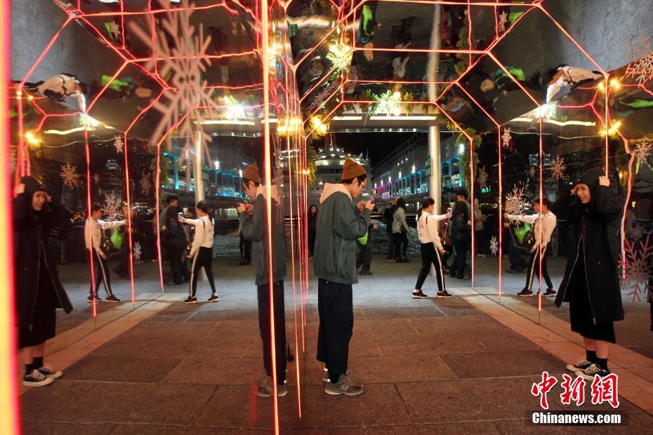 12月10日晚,游客在海港城打卡拍照。近日,香港尖东海滨一带的商厦点亮了璀璨的圣诞节灯饰,照耀维港两岸。即使圣诞节并非内地假期,但受惠“一桥一铁”通车带动,大批内地游客到港,香港零售市道向好。中新社记者 洪少葵 摄