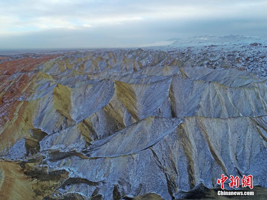 航拍甘肃张掖雪浴七彩丹霞宛如水墨画