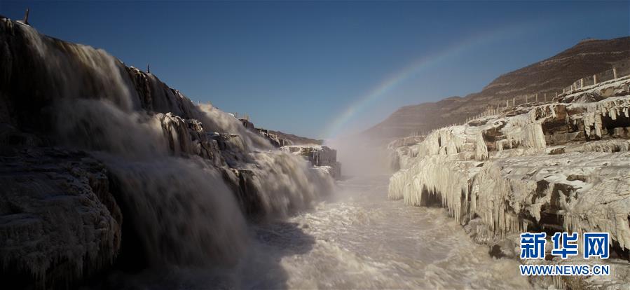 12月11日,黄河壶口瀑布上空出现彩虹,美不胜收(无人机拍摄)。 新华社发(刘宏达 摄)