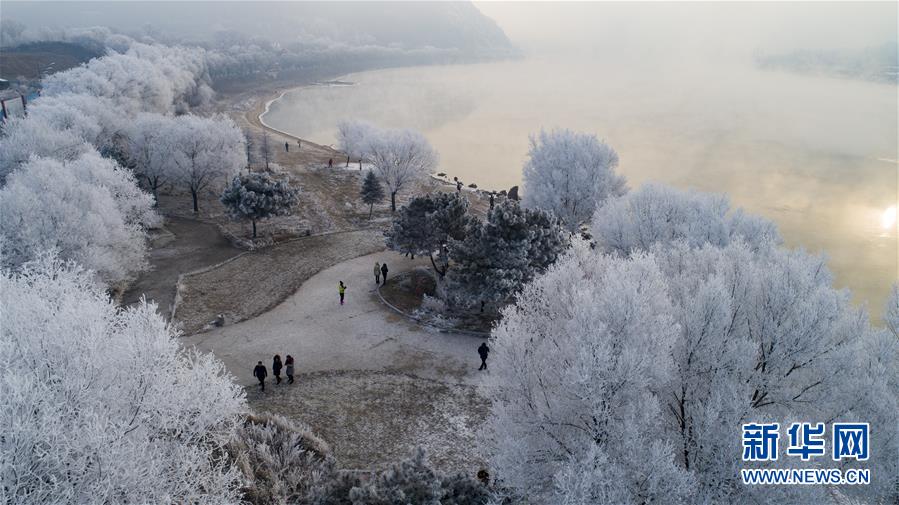 这是12月11日无人机拍摄的吉林省吉林市松花江畔的雾凇景观。 当日,吉林市松花江畔出现美丽的雾凇景观,沿江树木披上了洁白的银装。 新华社发(朱大鹏 摄)