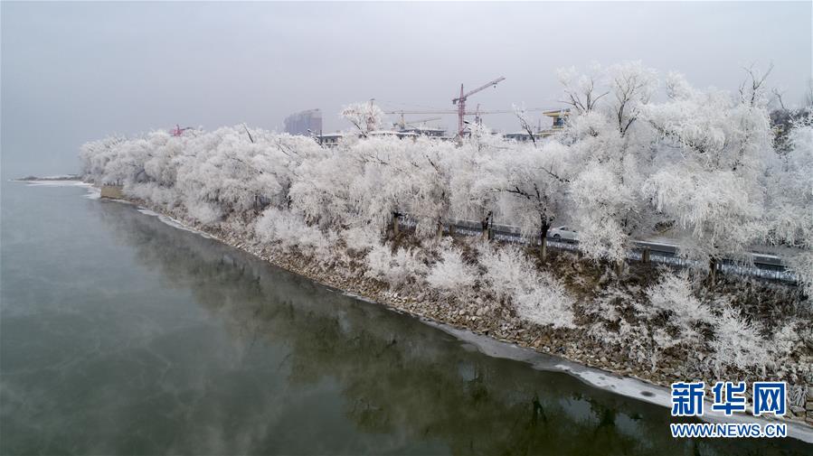 这是12月11日无人机拍摄的吉林省吉林市松花江畔的雾凇景观。 当日,吉林市松花江畔出现美丽的雾凇景观,沿江树木披上了洁白的银装。 新华社发(朱大鹏 摄)