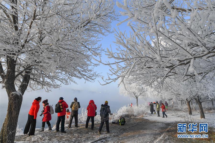 12月12日,游人在吉林省吉林市丰满区吉丰东路松花江畔观赏雾凇美景。
