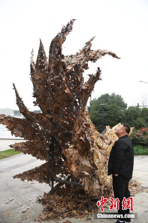 12月12日,一位市民驻足欣赏落叶装置艺术作品。近日,中国美术学院举办秋叶艺术节,众多以落叶设计的艺术作品亮相杭州西湖边,成为一道独特的风景。中新社记者 王刚 摄