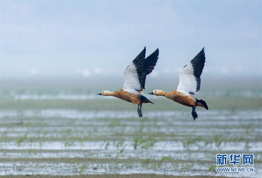 12月13日,两只赤麻鸭从江西鄱阳湖都昌湿地起飞。