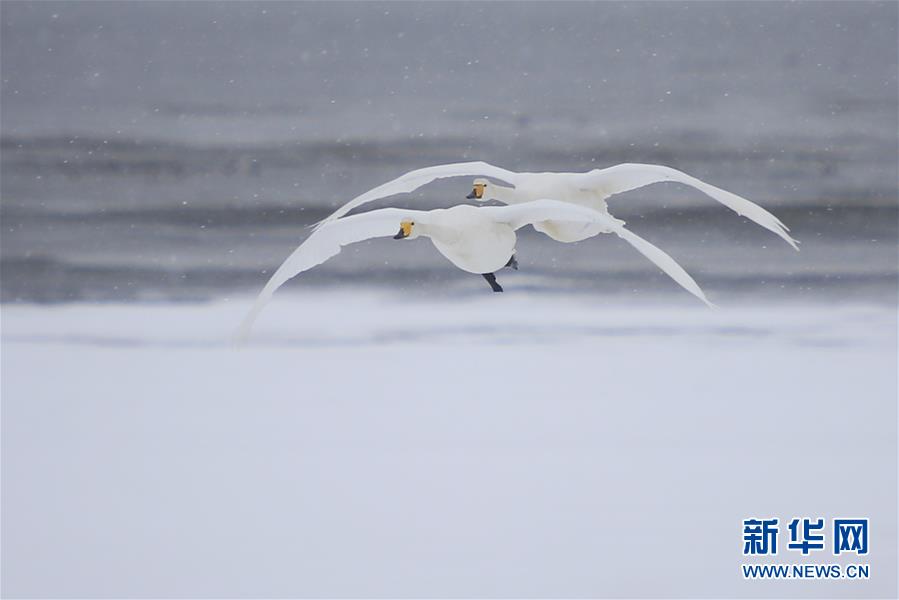 雪花送来天空的问候, 草木披上洁白的衣裳。 清冷与温馨交织眼前, 冬天,大自然谱写了又一曲华丽的乐章。 12月7日,天鹅在山东荣成天鹅湖畔飞翔。 新华社发(王福东 摄)