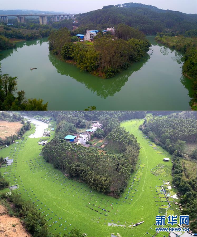 这是一张拼版图片。上图为2018年12月16日,村民划着小船行驶在广西柳州市浪江河上;下图为2017年5月3日,渔船在水葫芦泛滥的浪江河上艰难前行(无人机拍摄)。广西柳州市浪江河是柳江的支流,全长约10公里,每年都出现水葫芦泛滥的现象,给水域环境造成严重影响。近一年多以来,柳州市相关部门加大对浪江河水域综合治理,目前该河流进入常态化治理,实现“水清、岸绿、河畅、景美”的总目标。新华社发(黎寒池 摄)