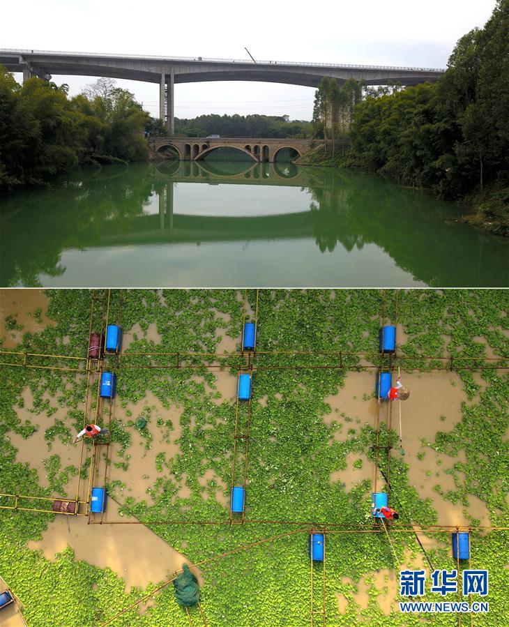 这是一张拼版图片。上图为2018年12月16日拍摄广西柳州市浪江河;下图为2017年5月3日拍摄的水葫芦泛滥的浪江河(无人机拍摄)。广西柳州市浪江河是柳江的支流,全长约10公里,每年都出现水葫芦泛滥的现象,给水域环境造成严重影响。近一年多以来,柳州市相关部门加大对浪江河水域综合治理,目前该河流进入常态化治理,实现“水清、岸绿、河畅、景美”的总目标。新华社发(黎寒池 摄)