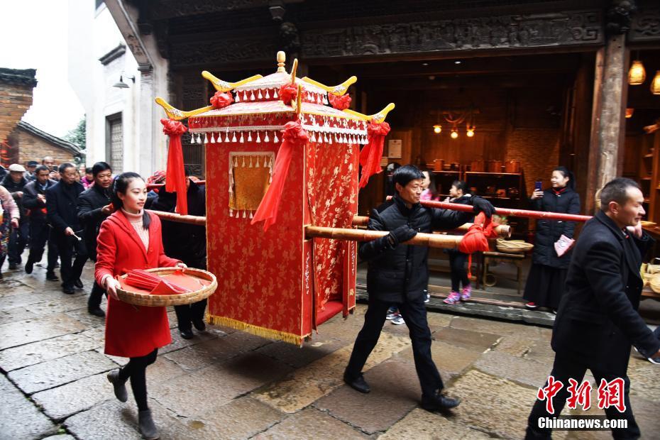 12月16日,北方地区大量游客来到江西婺源篁岭古村。当地准备了一场传统嫁娶婚俗表演,带领游客全程体验古徽州婚俗的魅力。当日,接亲队伍按照传统的徽州婚俗,抬着花轿、吹着唢呐、敲着锣鼓,欢欢喜喜地将新娘的花轿抬往新郎家,“新人”不时向游客抛喜糖,现场喜气洋洋,热闹非凡。婚房中拜天地、拜高堂、掀盖头、撒粿籽等环节,真实再现了徽州传统婚俗。方华彬 摄