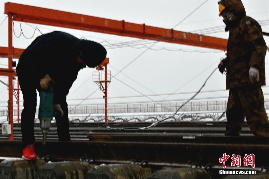 风雪中,轨排生产线上的施工工人。文/赵朗 俞文喜 图/俞文喜
