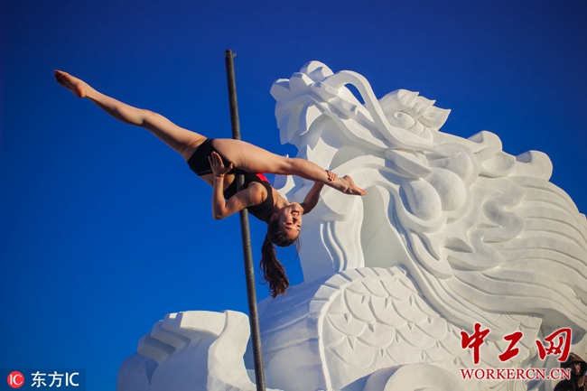 2018年12月20日,第四届钢管舞极寒挑战赛在漠河北极村举行,来自中国16名竞技钢管舞爱好者和10名中国钢管舞国家队队员,共计26名选手身着背心短裤进行极寒挑战。北极村位于黑龙江省大兴安岭地区漠河市漠河乡,是中国观测北极光最佳地点,也是中国最北的城镇。北极村全年平均气温在-5℃左右,冬季的极端最低气温可降至-50℃。(本组图片来源东方IC,请勿转载)