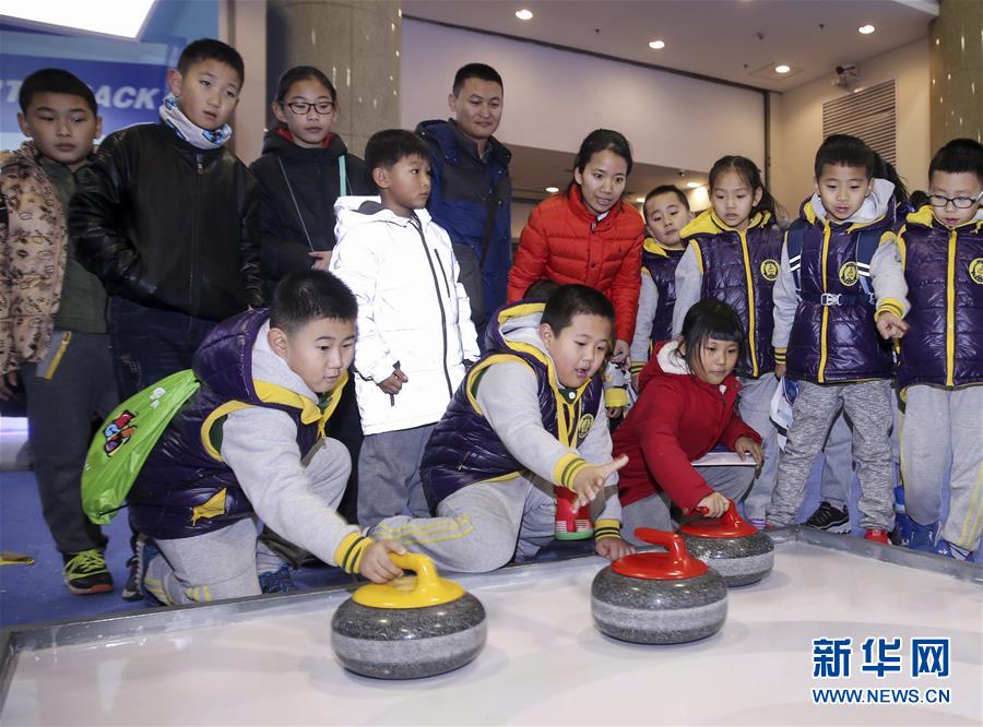 12月23日,小朋友在首届中国冰雪大会上体验冰壶项目。 当日是周末,正在北京展览馆举行的首届中国冰雪大会吸引了众多参观者。 新华社发(陈晓根 摄)