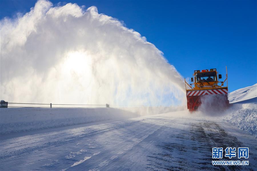 一辆清雪车在布尔津县通往喀纳斯景区的公路上清除积雪(12月22日摄)。新华社记者 沙达提 摄