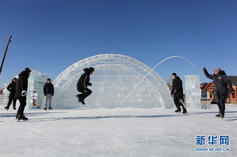 12月24日,在河北省承德市丰宁满族自治县大滩镇,人们在体验冰上跳绳。承德市丰宁县大滩镇将于月底举行冰雪主题的旅游节。旅游节以坝上冰雪景观为基础,将举办亲子冰雪嘉年华、冰雪美食体验、坝上庙会、冰雪游乐总动员等一系列旅游活动。新华社发(刘环宇 摄)