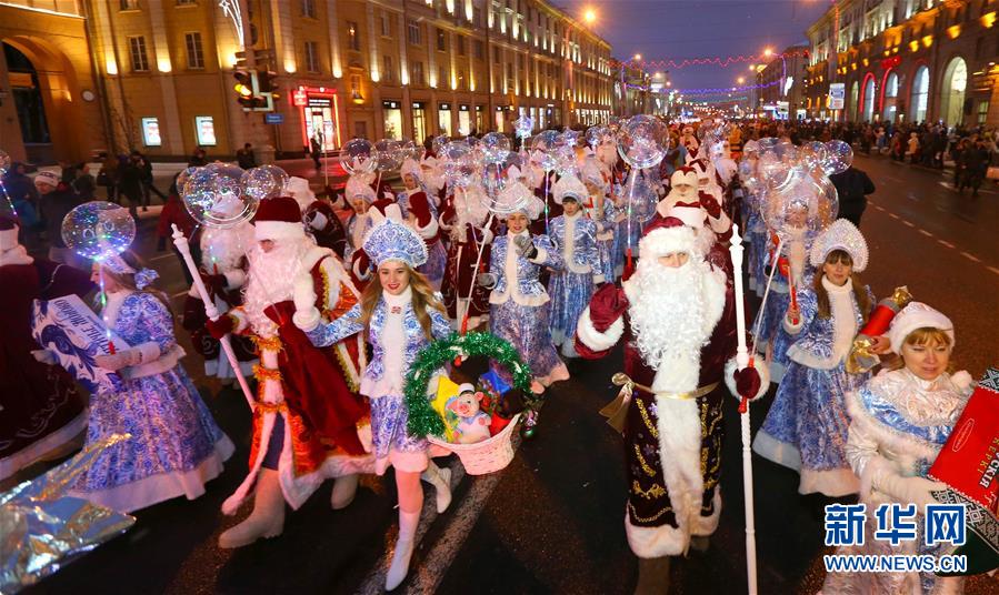 12月24日,在白俄罗斯首都明斯克,人们装扮成“严寒老人”和“雪姑娘”参加新年巡游。新华社发(马祖列维奇摄)