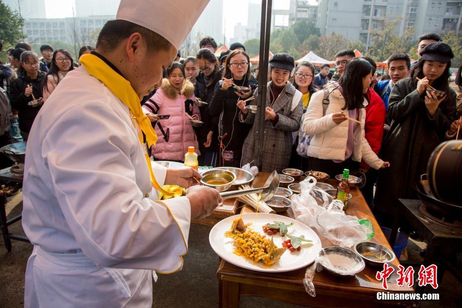 12月24日,武汉科技大学一年一度的“沁湖鱼宴”正式开席。在校园里除了能吃鱼,还能亲手捕鱼、烹鱼;品尝鱼肴的同时,还能跟着食堂大师傅们体验一把丰收的喜悦和掌勺的乐趣。这个已经被正式定名为“沁湖鱼宴”的活动,从2015年始,武科大已经连续举行了四年。中新社记者 张畅 摄