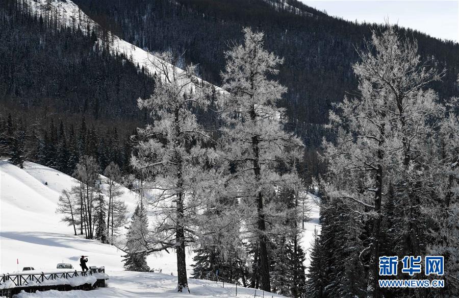 游客在喀纳斯景区神仙湾拍摄雾凇(12月23日摄)。 新华社记者 刘大伟 摄