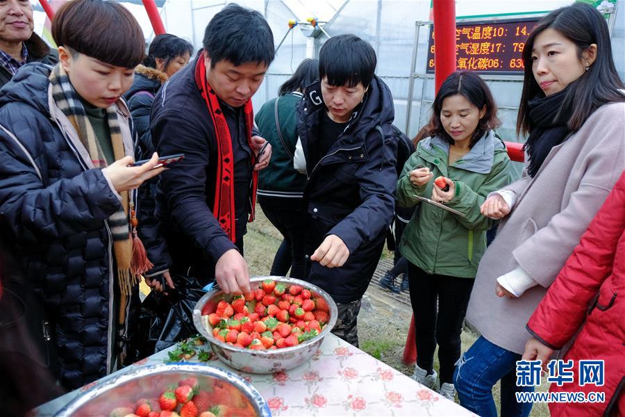12月25日,首批乘坐杭黄高铁抵达建德站的游客,在“全民导游”代表们的带领下来到当地草莓大棚品尝新鲜草莓。 当日,杭州至黄山高铁正式开通运营,从杭州至下辖建德市的最快车程缩短至约50分钟。建德当地采摘游、乡村游等农业观光项目吸引了沿线游客。 新华社记者 徐昱 摄