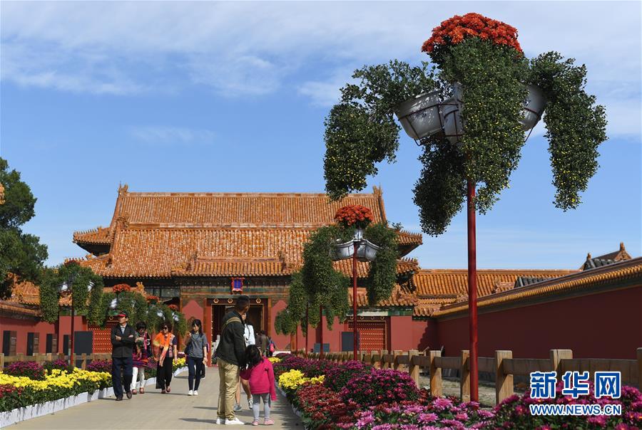 这是故宫内摆放的菊花(2016年9月27日摄)。 故宫内的花草树木种类繁多。漫步紫禁城,总能在不经意间遇见红墙琉璃瓦映衬下的一抹姹紫嫣红。 新华社记者金良快摄