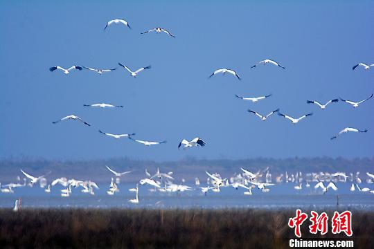 12月26日,大批珍禽候鸟在江西鄱阳湖之滨的沙湖山一带栖息。连日来,中国最大淡水湖鄱阳湖候鸟保护区内,大批白鹤、白鹳等珍禽候鸟漫天飞舞,吸引了来自各地的游客和摄影爱好者前来。