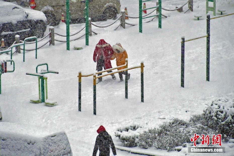 12月27日,因受冷空气影响,山东半岛多地迎来小到中雪局部大雪天气,最低气温达零下13摄氏度。图为行人在山东省烟台市福山区街头冒雪出行。中新社发 孙文潭 摄 图片来源:CNSPHOTO