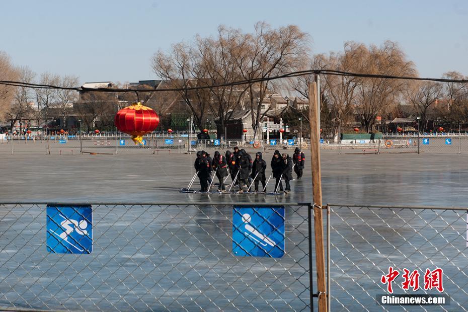 12月27日,北京进入冰冻模式,最高气温仅有-5℃,最低气温-12℃,并伴有七级阵风,体感非常寒冷。这样全天处在冰点以下的天气还将持续到30日,公众需注意防寒保暖。图为北京前海湖面结冰,工作人员清理冰面,冰场将开门迎客。中新网记者 李骏 摄