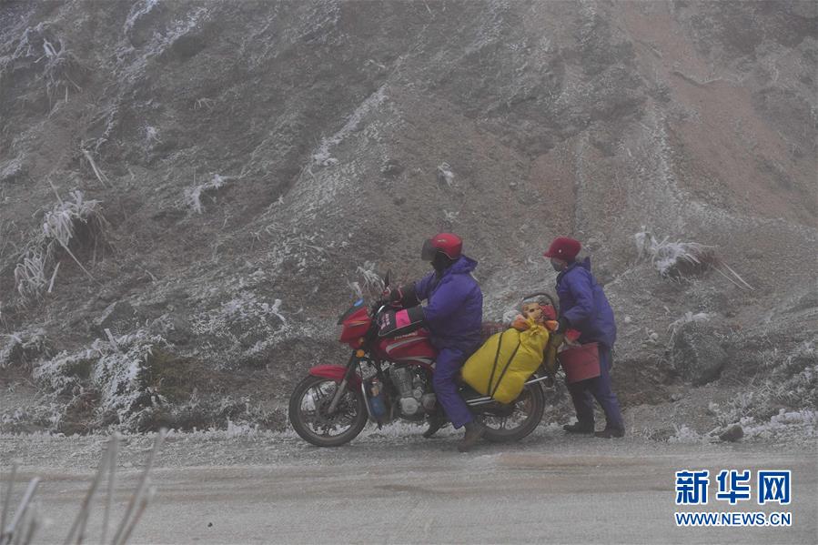 12月28日,在广西融水苗族自治县杆洞乡高强村,村民在结冰的道路上行进。当日,受强冷空气影响,广西气温大幅下降。气象部门预计,未来3天广西将持续阴雨寒冷天气。新华社记者 黄孝邦 摄
