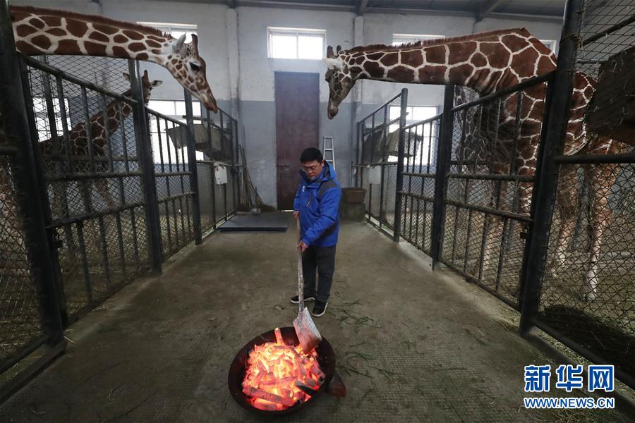 12月28日,宁波雅戈尔动物园工作人员为长颈鹿生起火盆。 近日,受较强冷空气影响,浙江宁波气温走低。当地动物园加强保暖措施,保证园区动物安然过冬。 新华社发(张培坚 摄)