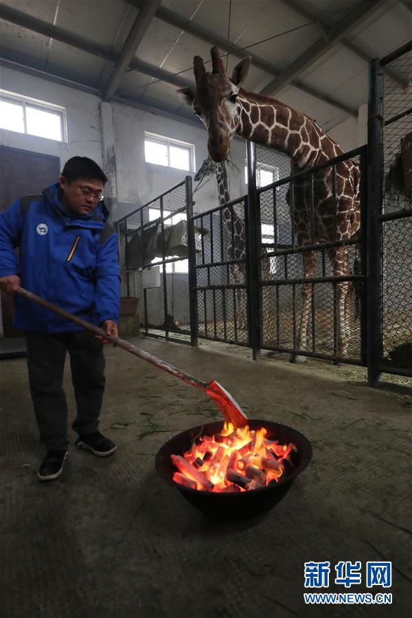 12月28日,宁波雅戈尔动物园工作人员为长颈鹿生起火盆。 近日,受较强冷空气影响,浙江宁波气温走低。当地动物园加强保暖措施,保证园区动物安然过冬。 新华社发(张培坚 摄)