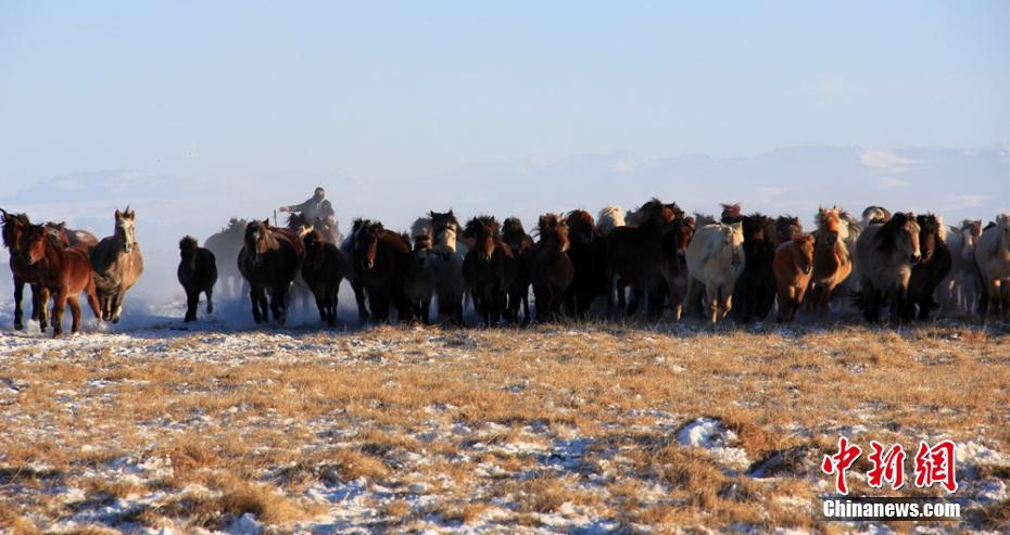 12月28日,在地处天山深处的新疆和静县巴音布鲁克大草原上,气温达到零下32℃,一望无际的大草原上白雪皑皑,上万匹骏马洋洋洒洒、踏着积雪,从游人的眼前呼啸而过,场面气势恢宏。史玉江 摄