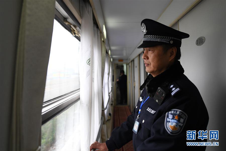 1月1日,在越南河内(嘉林)开往中国南宁的列车上,乘警杨铁鸣注视着车外。 新华社记者陆波岸摄