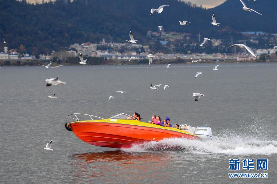 1月1日,市民和游客在滇池草海乘坐游船观赏红嘴鸥。 新华社记者胡超摄