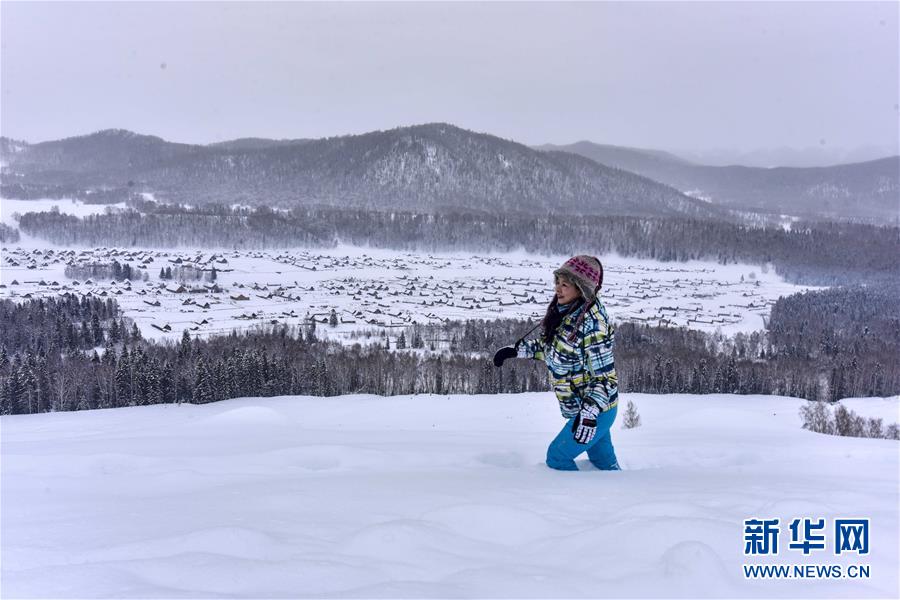 1月1日,在新疆禾木雪乡,一名游客体验积雪厚度。