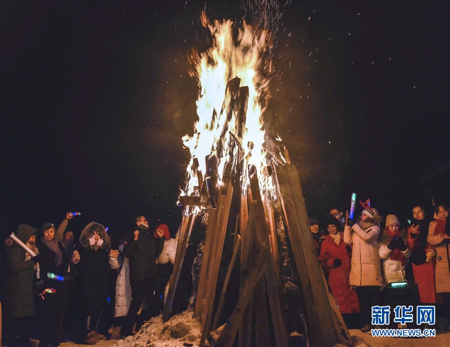 2018年12月31日晚,新疆禾木雪乡举办篝火迎新晚会,来自各地的游客齐聚禾木迎接新年。 新华社记者赵戈摄